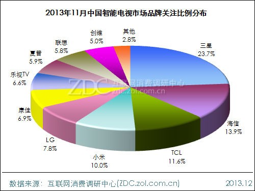 (图) 2013年11月中国智能电视市场品牌关注比例分布