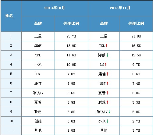 2013年11月,中国智能电视市场上,各品牌的关注排名变化频繁,TCL、LG、康佳、创维、夏普和联想的排名上升,而海信、乐视TV和小米的排名下滑。与10月相比,TCL以16.5%的关注比例取代海信成为本月亚军,同时,海信下落至季军位置,关注比例为12.5%,较上月有所下滑,但降幅不大。