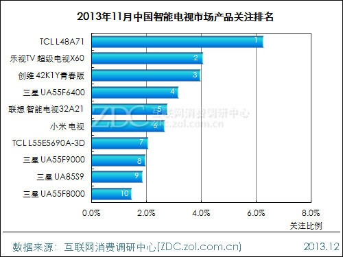 2013年11月,中国智能电视市场上,TCL L48A71以6.3%的关注比例取代小米电视成为本月最受消费者关注的智能电视产品,这款48英寸、1920*1080分辨率的3D、网络、智能电视本月末报价为4567元,与上月相持平。