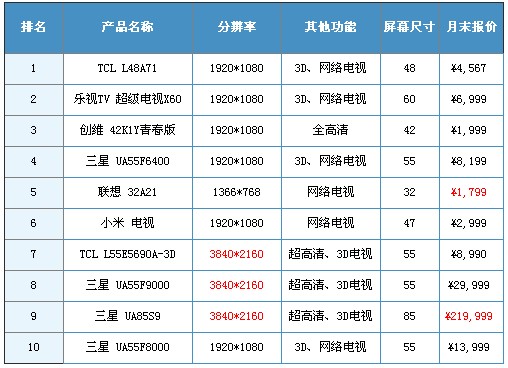 值得注意的是,本月关注比例靠前的十款产品分属六家不同的品牌,其中三星共拥有四款产品登上榜单,产品关注优势比较明显。该十款产品的屏幕尺寸相对较大,除联想 32A21外,其余产品的屏幕尺寸均在40英寸以上,最大尺寸高达85英寸,平均产品尺寸为53.4英寸。产品售价从1799元到219999元不等。同时本月还有三款超高清智能电视上榜,分别是TCL L55E5690A-3D、三星 UA55F9000和三星 UA85S9。