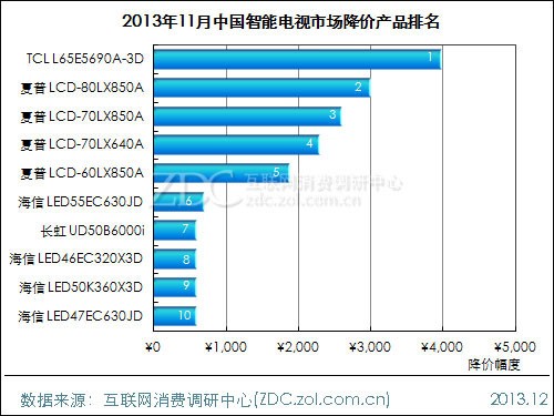 在本月所有的降价产品中,TCL L65E5690A-3D降价幅度最大,这款65英寸、3D、网络、智能电视在11月初报价为21990元,在月末降为17999元,降幅高达3991元,也是上榜产品中为数不多的两款超高清电视之一,另一款超高清智能电视是长虹 UD50B6000i,本月末报价为7399元,降价幅度为600元。