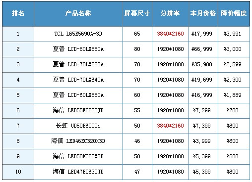 值得注意的是,本月夏普共有四款产品登上榜单,它们分别是夏普 LCD-80LX850A、夏普 LCD-70LX850A、夏普 LCD-70LX640A和夏普 LCD-60LX850A,其降价幅度均在千元以上,从1889元到3000元不等。产品尺寸相对较大,均在60英寸以上。