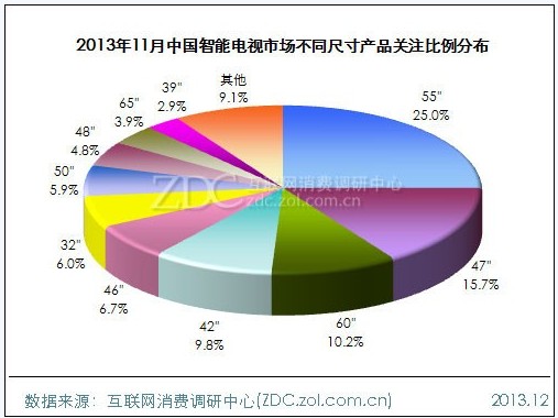 (图) 2013年11月中国智能电视市场不同尺寸产品关注比例分布
