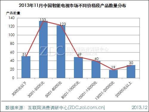 (图) 2013年11月中国智能电视市场不同价格段产品数量分布