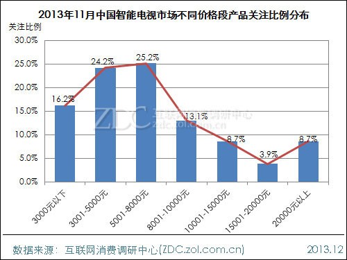 (图) 2013年11月中国智能电视市场不同价格段产品关注比例分布