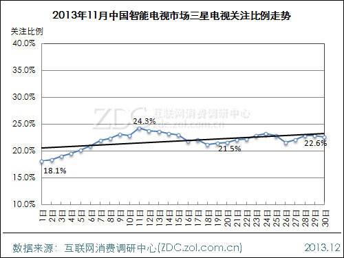 2013年11月,中国智能电视市场上,三星智能电视的关注比例呈上升走势。从图中可以看出,三星在本月初关注比例处于最低值18.1%,之后逐步上升,并在11日达到本月最高值24.3%,随后关注比例基本保持在21.0-25.0%之间,最后在月末稳定在22.6%,较月初上涨了4.5%。