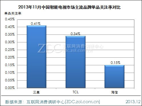 2013年11月,中国智能电视市场上,在单品关注率方面,前三甲品牌的单品关注率与排名保持一致,三星的单品关注率依旧相对最高,为0.41%,TCL次之,为0.34%,海信由于产品数量相对较多,导致单品关注率相对最低,仅为0.15%。