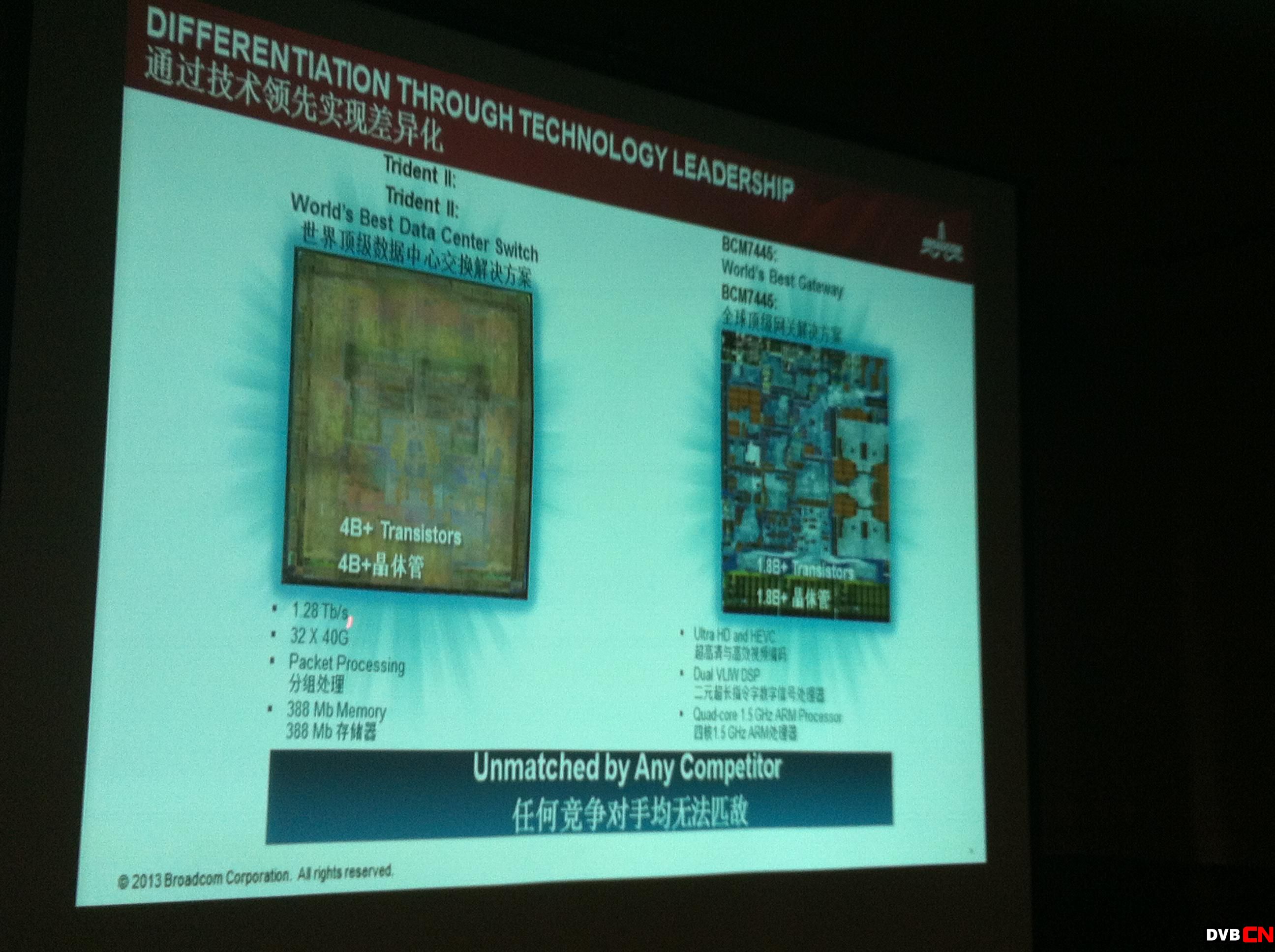 更加令人望其项背的是博通的芯片技术:世界顶级数据中心交换解决方案Trident 2和全球顶级网关解决方案BCM7445,这是任何竞争对手均无法匹敌的!