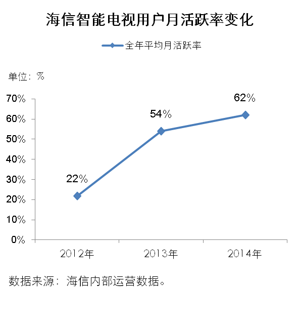 另外,海信智能电视活跃率增长迅速,2014年日均活跃率为37.0%,日活跃用户达296万,全年平均月活跃率达62% 。