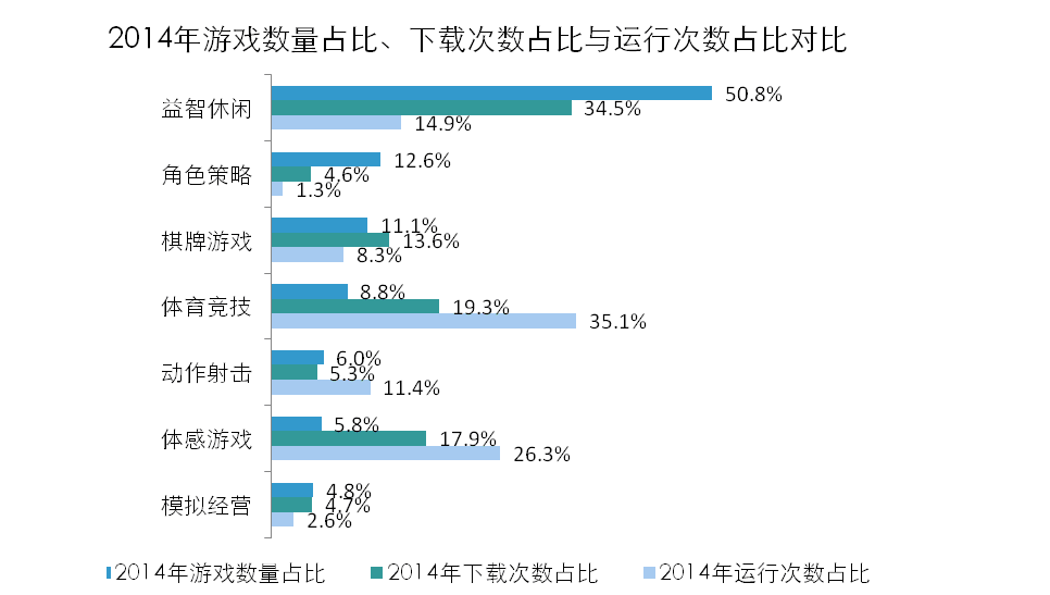 图为:2014年游戏数量占比、下载次数占比与运行次数占比对比二、电视游戏的问题和未来