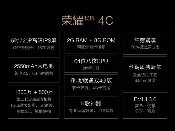 可能下面的人会问了,说赵明你讲这么多,是不是告诉我,你这个手机整个定价都是合理的?下面我们就要来给大家揭晓荣耀4C的价格。