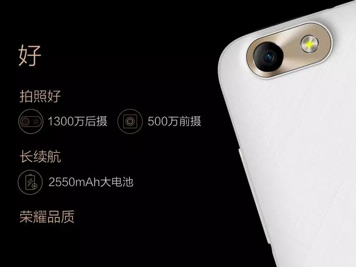 在设想方面,我们把后置摄像头采用了1300万像素,前置摄像头500万象素。当然长续航永远都是荣耀的DNA,我们这里用了2550mAh的大电池。
