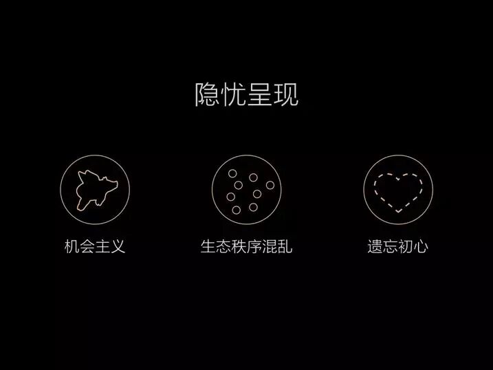 风口上的猪非常流行,这仅仅只是说明今天互联网的风口给了我们很多机会。而我就在想象,如果天空中一群猪翱翔会是一个什么样子。我非常忧虑,如果风停了,风转向了,猪噗通噗通掉下来摔死了我们又该怎样?我们首先要思考,作为“笨鸟”而言首先要自己能飞。生态秩序,太多无原则的跨界引起行业的忧虑,当我们取得初步成功之后,忘记了当初为什么出发。我们出发的时候怀着各种各样的理想,各种各样的信念,当我们初始成功的时候,我们想突然之间转变为为销量而生,为上市而生,这是非常可怕的。因为当企业你最辉煌的时候也是你危机最大的时候,如何能够坚守住自己的信念?