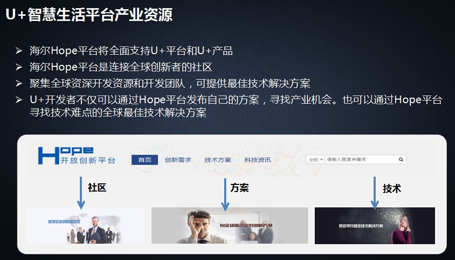 王总说,海尔做智能家居已经10多年,有强大的基础积累、工程积累,以及研发资源积累,所以有能力做这个事情。第二,通过和互联网公司的交互,学习用互联网思维搭建海尔U+平台,从技术架构上海尔也学了互联网云平台技术,参考了国际通用的架构标准,所以整体来说我们技术比较先进。另外,从资源汇入上,海尔U+平台汇集了成百的产品商加入进来,给用户提供更加个性化的体验。