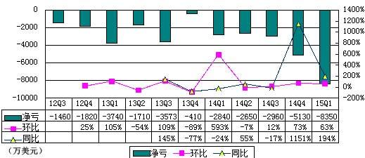 优酷土豆第一季度净亏损为5.174亿元(约合8350万美元),较上一年同期净亏损1.76亿元(约合2840万美元)扩大194%。