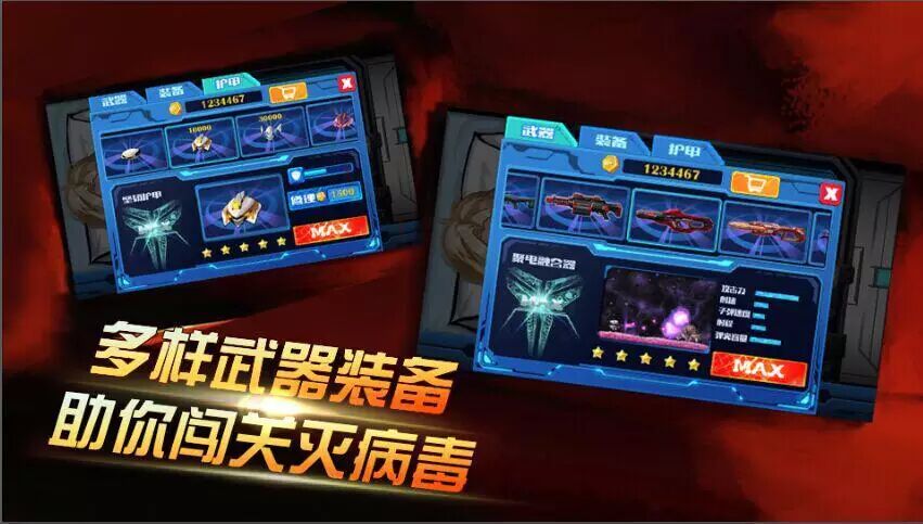 独有双武器功能,可以随时随地切换枪支,应对多种病毒流畅自如。武器拥有攻击力、射速、子弹速度、射程、弹夹容量5种属性,每种武器还可升级,最高可升至5星。此外,玩家可以装备一种战斗道具,手雷、核心爆破、无人机、恢复剂等,而游戏中还会有各种补给漂浮而来,一种类似魂斗罗中武器补给的出场方式。这些战斗中细节的设计为整个闯关过程助力。