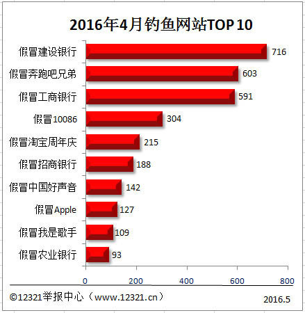 被举报最多的是假冒“建设银行”的钓鱼诈骗网站,举报量达716件次,比3月份增加了24.0%。排名第二的是假冒“奔跑吧兄弟”,比3月份增加了4.1%。