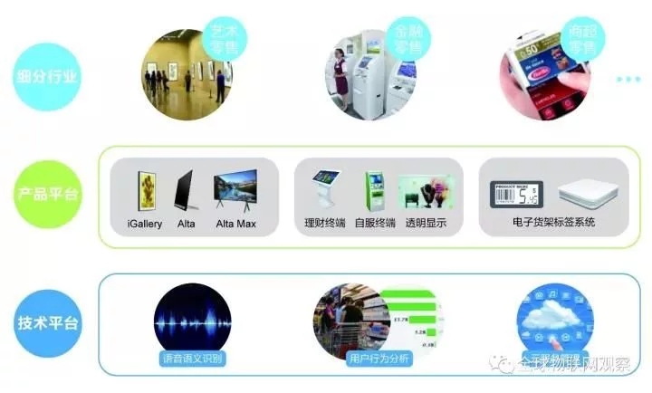 关于智慧零售业务,京东方主要搭建了两个物联网平台:一个是依托于终端产品“画屏”的数字艺术零售,另一个是依托于电子标签ESL的智慧零售物联网。