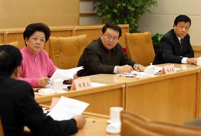 1月17日,中共中央政治局常委李长春在北京出席广电总局广播电视村村通工作现场会并发表讲话。中共中央政治局委员、书记处书记、中宣部部长刘云山(右一)主持会议。国务委员陈至立(左二)出席会议。 新华社记者 高洁 摄