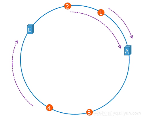 如上图,我hash到了A和C之间,图片的存储规则是顺时针方向的存储,所以应该存储到A,如果有四张的话如下图