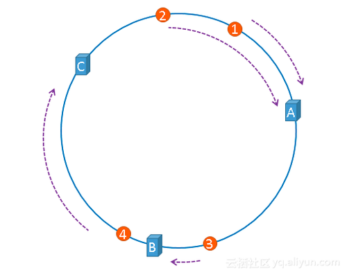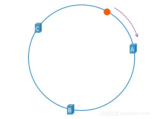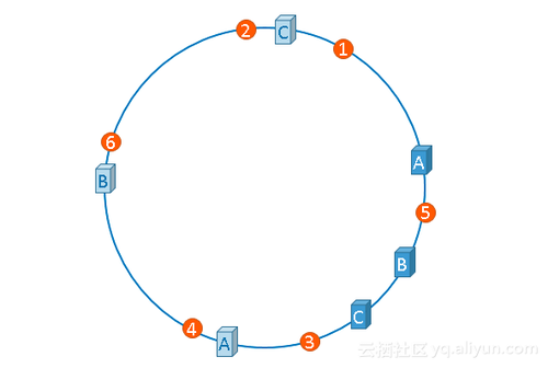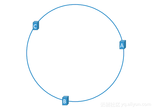 具体就是比方我有三个服务器A,B ,C对其进行 hash (服务器Aip)%2^32 得出来的一定是一个整数,而且一定是在0--2^32之间,那么这个数就会分布在hash环上对应的位置,相同的B,C都一样,假设我们hash过后ABC的位置如下图