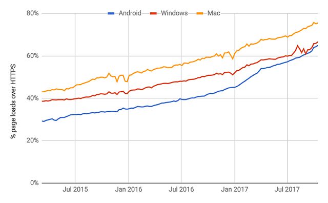 目前我们看到网络加密的速度比历史上的任何时候都要快,全站HTTPS正在取得令人惊叹的进展,谷歌在去年公布了一组Chrome浏览器的数据,我们看到HTTPS网站的迅猛增长: