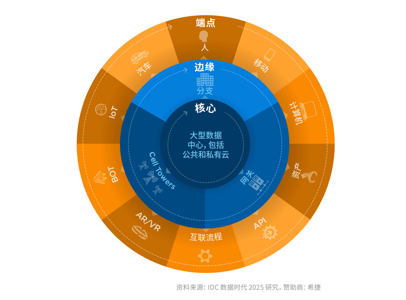 在全球数据圈中,数据传播主要存在三种位置:用户终端设备为代表的端点、服务器和基站为代表的边缘、企业和云计算数据中心为代表的核心。