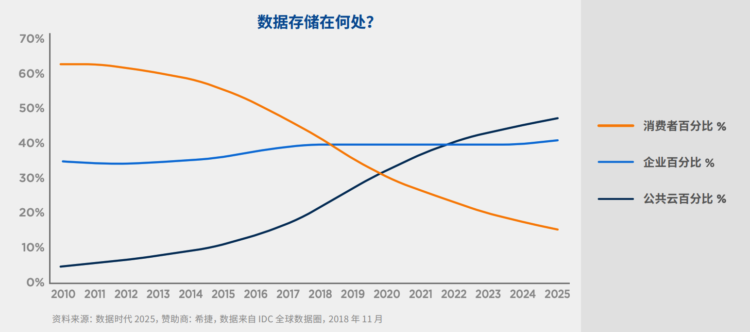 端点比例的下降也表现在数据存储位置,随着更高智能水平的设备连接,消费者逐渐接受了端点设备存储容量较小的事实,更多的数据将被企业所管理。IDC认为,到2020年,存储在公共云中的数据将超过存储在消费者设备中的数据,而到2025年,存储在公共云和企业的百分比将远超于消费者的百分比。