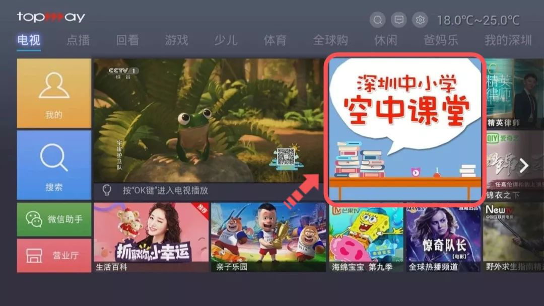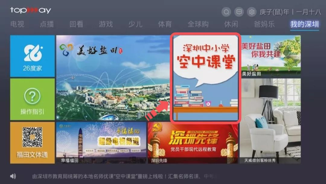疫情当前,按照深圳市委市政府的防控总要求,以及广东省教育厅发布的《关于加强疫情防控期间中小学教育教学管理工作的通知》精神,深圳市教育局联合深圳广播电影电视集团,利用深圳市天威视讯的有线电视网络,统筹本地名优师资资源,上线优质课程,通过开设免费电视端“空中课堂”供全市中小学生远程教育使用。确保了全市中小学生真正做好“停课不停学,离校不离教”,防疫学习两兼顾。