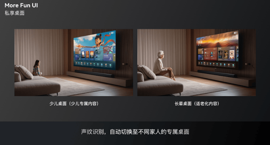 个性化的专属桌面功能:魔方桌面针对家庭多成员使用场景,独创声纹识别技术,只需语音指令就能在标准模式、长辈模式、儿童模式间无缝切换,为每位成员提供专属的桌面体验。