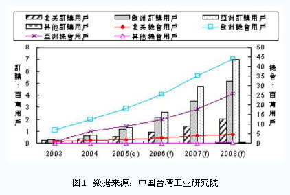 电信业者在网络的频宽与技术逐渐纯熟之下,由过去的语音、数据服务进展至影音的服务。在全球电视数字化的发酵下,电信业者也加入数字电视服务的战场,利用具有基础网络的优势下,开始向其宽频用户推展数字电视服务。全球IP-TV的订购用户数在2004年约有将近170万的用户,各地区均为萌芽期,预计到2008年用户数将成长至1400万用户,2004~2008年年复合成长率为71%,成长非常迅速(见图1)。