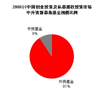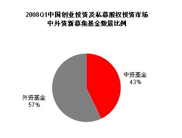 2008年第一季度,中国创业投资及私募股权投资市场新募集中资基金数量为6个,基金规模为3.37亿美元,平均单支基金规模为5600万美元;外资基金为8个,基金规模为32.90亿美元,平均单支基金规模为4.11亿美元。