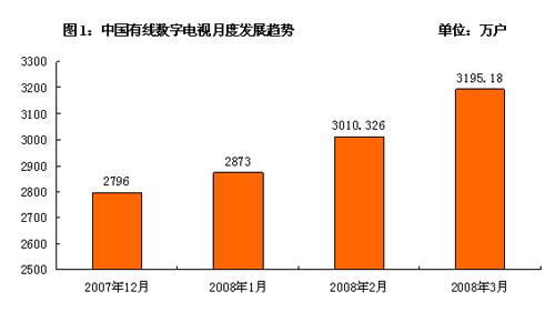 中国有线数字电视用户08年1季度突破3195.18万户,预计2季度达到3965.93万户