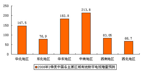 图2:2008年2季度中国各主要区域有线数字电视增量预测 单位:万户