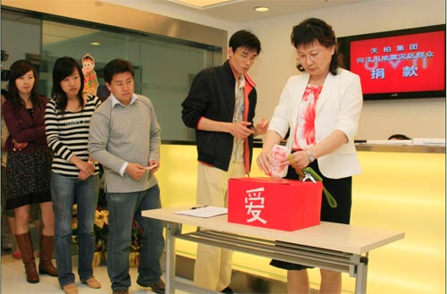 “伸出援手,抓住每一丝生命的希望,血脉之亲不离不弃”,5月14日,地震发生后的第二天,天柏集团组织了全体员工的捐款活动,截止5月16日天柏集团各地员工募捐的第一笔近20万元善款已经送达相关单位,目前天柏集团各地机构的捐款活动还在继续中。