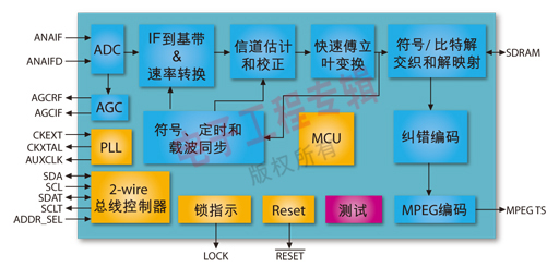 5.内嵌高性能的10位数模转换器,对中频(4.57MHz和36.167MHz)进行直接采样;