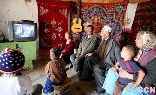 富蕴县吐尔洪乡乌亚拜村民哈孜拜(右三)老人一家三代在看直播卫星电视节目