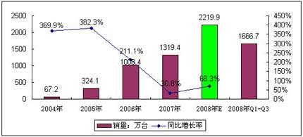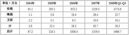进入2008年,中国数字电视产业特别是有线数字电视产业保持了快速发展的势头,数字电视机顶盒市场与数字电视整体转换同步发展,市场规模不断增长。2008年前三季度中国机顶盒市场销量迎来井喷,赛迪顾问的调研数据显示,前三季度中国市场共销售机顶盒1666.7万台,同比增长了83.4%。