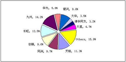在品牌市场方面,九洲在2008年全面发力,国内国际市场双丰收;长虹继续有稳定的表现,以12.5%的份额位居品牌排名第二位;天柏和同洲销量也持续增加,分别位于市场第三和第四位,销售量市场占有率为11.3%和9.7%。值得一提的是,随着市场销量的暴涨,除TOP10之外,其它品牌也有了较好的表现,市场份额有了较大的提高。相比2007年,前十名企业的市场集中度出现了下滑,究其原因,主要是因为市场增长很快,主流企业的生产规模和影响力难以满足全部新增市场的需求,不少地方性的小企业抢占市场所致。