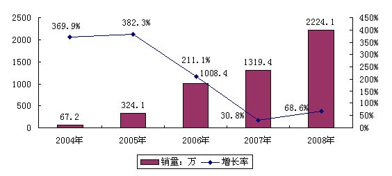 图1 2004-2008年中国数字电视机顶盒市场销售量及增长