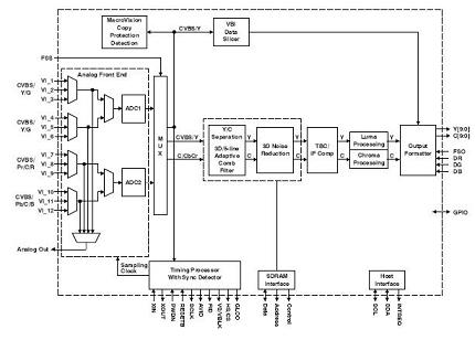 图2所示为视频解码器的数据流路径,它负责处理NTSC、PAL、SECAM、S-Video、SCART、YPbPr、RGB、480p和其它输入格式。在数字电视中,对这种级别的灵活性的支持是必需的,完全是为了让一个机型经过实际设置可以工作于任何格式。数字电视解码器的典型性能特征包括:同步、消隐、场、有源视频窗口、水平和垂直同步、时钟、同步锁相(用于下行视频编码同步)、主CPU中断和可编程逻辑I/O信号。这是对数字视频输出以及用于先进的垂直消隐期(VBI)数据恢复的补充。作为一种附加功能,一些视频解码器支持VBI数据处理器(VDP)在文字电视广