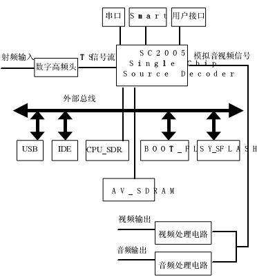 SC2005提供了多种外围设备接口,包括两个UART接口、两个智能卡接口、I2C接口、IEEEl284接口、红外接口、图文电视接口、通用I/O控制以及调制解调器接口。通过这些接口,SC2005可以和多种外围设备相连,其功能更加强大。另外,SC2005还有一个硬盘接口,可以将节目下载到硬盘中,以后再看。