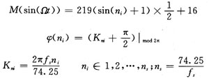 以多波群测试信号为例,他包含了亮度多波群信号和色度多波群信号,信号在任何瞬间的值可用数字硬件中的数代表。对于亮度多波群信号,根据1125/50高清析度电视亮度信号采样频率(74.25 MHz),为避免相位跳变,多波群测试信号各组应含整个采样周期,其频率自左向右各组正弦波的频率(fs)可分别取4.125 MHz,6.187 5 MHz,7.425 MHz,10.6 MHz,14.85 MHz,18.56 MHz;对于色度多波群信号,根据数字电视色差信号采样频率(370 125 MHz)的要求,其频率自左向右各组正弦波的频率(fs)可分别取2.063 MHz,3.094 MHz,3.713 MHz,5.3 MHz,7.425 MHz,9.28 MHz;每组320个取样点,其方程为: