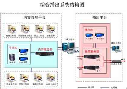 综合播出系统设计基于“编播分离”安全机制,以下是采用视频服务器1 +1热备的综合播出系统结构图: