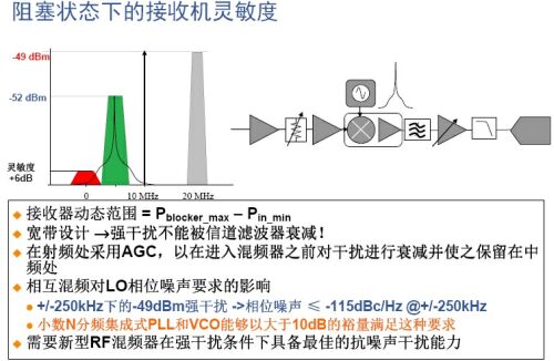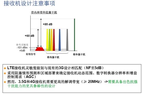 LTE对发射通道的总的性能要求为:1)3.5G LTE频谱质量和辐射限制应当符合现有3G WCDMA规格要求;2)单载波LTE发射器可以与3G架构非常类似;3)EVM和频谱质量是关键指标;4)DAC的动态范围由发射的LTE(或WCDMA)载波数量决定。对高动态范围的多载波设计而言,建议采用16位DAC。5)目前业内的宽带IQ调制器可以提供必需的动态范围:SFDR=2/3(OIP3-NSD)〉80dB。6)为得到最好的EVM性能,建议选择集成VCO的宽带小数-N合成器。7)为了满足频谱质量和高PAR OFDM要求,必须选用高线性度前置放大器和功放。