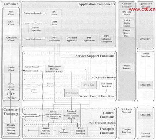 IPTV架构文档中给出了IPTV高层体系架构以及具体的IPTV功能架构。目前的输出文档中IPTV高层架构有两套体系,图1是中国代表图提出的IPTV高层架构。