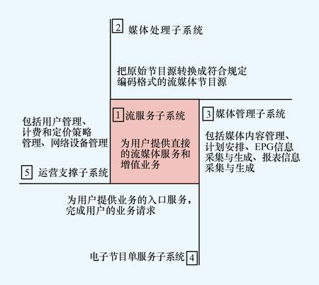 围绕这个问题,必须充分考虑电信级系统所必要的一些保证体系,如运营支撑系统、网络管理系统等。一般认为,IPTV系统在逻辑上可以划分成五个部分:媒体处理子系统、媒体管理子系统、电子节目单服务子系统、运营支撑子系统、流服务子系统。
