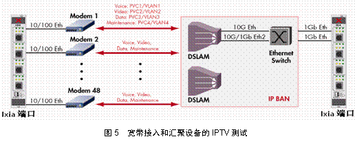 IXIA在实际的宽带接入和汇聚设备测试中,特点和优势非常明显,可以仿真真实用户的行为,比如PPPoE接入方式上运行HTTP和VoIP的流量,同时在Q-in-Q接口上运行IPTV业务,这种测试方式完全以家庭用户为单位,非常真实地评估宽带接入设备的性能。
