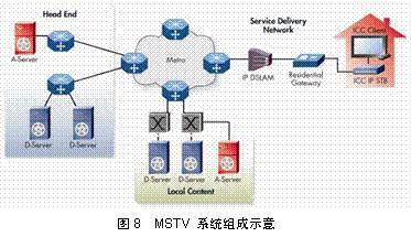 微软IPTV的实现特点结合了业界的一些技术特点并且增加了微软公司特有的一些协议。运行在微软公司平台上的一些高性能服务器在运营商的网络上,为用户提供内容存储和高效的视频分发服务。在MSTV系统中,主要有获取服务器和分发服务器两种类型(见图8)。