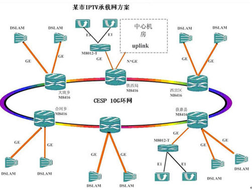 下面是网通某地市基于CESP的IPTV承载网方案。传统的IPTV承载都是通过2.5G MSTP或RPR千兆环来传输流媒体数据的,其问题在于:按照现有的IPTV用户数和明年计划发展用户数,平均每个村有近50个IPTV用户,一般一个乡要管辖30个村,按照每户IPTV 2M的带宽分配,一个乡就需要3G的接入带宽才能满足业务发展的需求,而现有的千兆环和2.5G MSTP根据就无法满足日益膨胀的数据业务需求,急需采用一种全新的数据承载平台来改造现有的县、乡、村的数据接入网络。